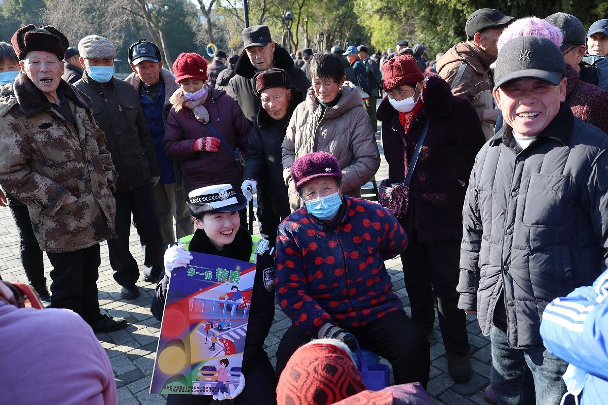 1月7日,在第六個中國人民警察節(jié)到來之際,安徽省巢湖市公安局交管大隊民警走進(jìn)老年人休閑聚集地洗耳池公園,開展交通安全主題宣傳。