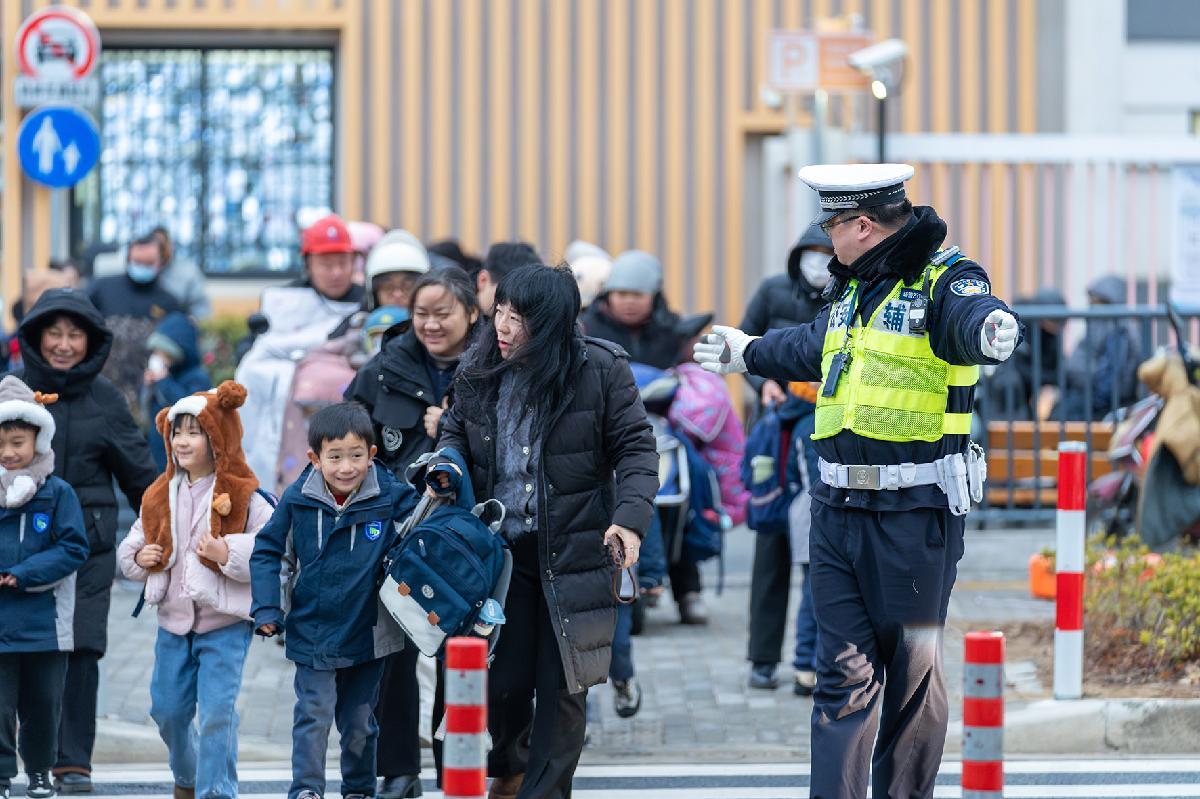 1月19日,山東省煙臺市公安局芝罘分局民警冒雪在轄區(qū)幼兒園門口執(zhí)勤,護送孩子們平安放學。