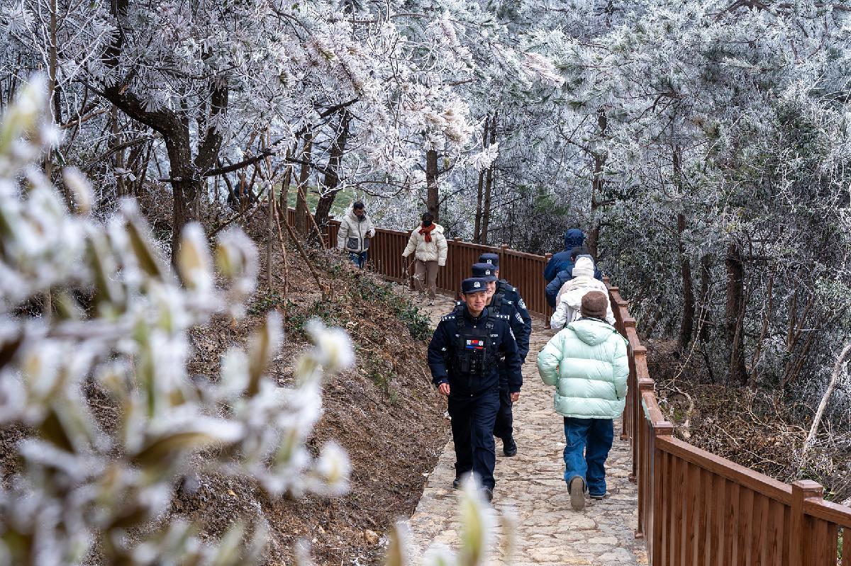 1月22日,受寒潮影響,浙江省臺州市黃巖區(qū)大寺基林區(qū)出現(xiàn)壯美的霧凇景觀,吸引了大批游客。臺州市公安局黃巖分局寧溪派出所加強林區(qū)的巡邏防控,服務群眾,確保游客平安出行。
