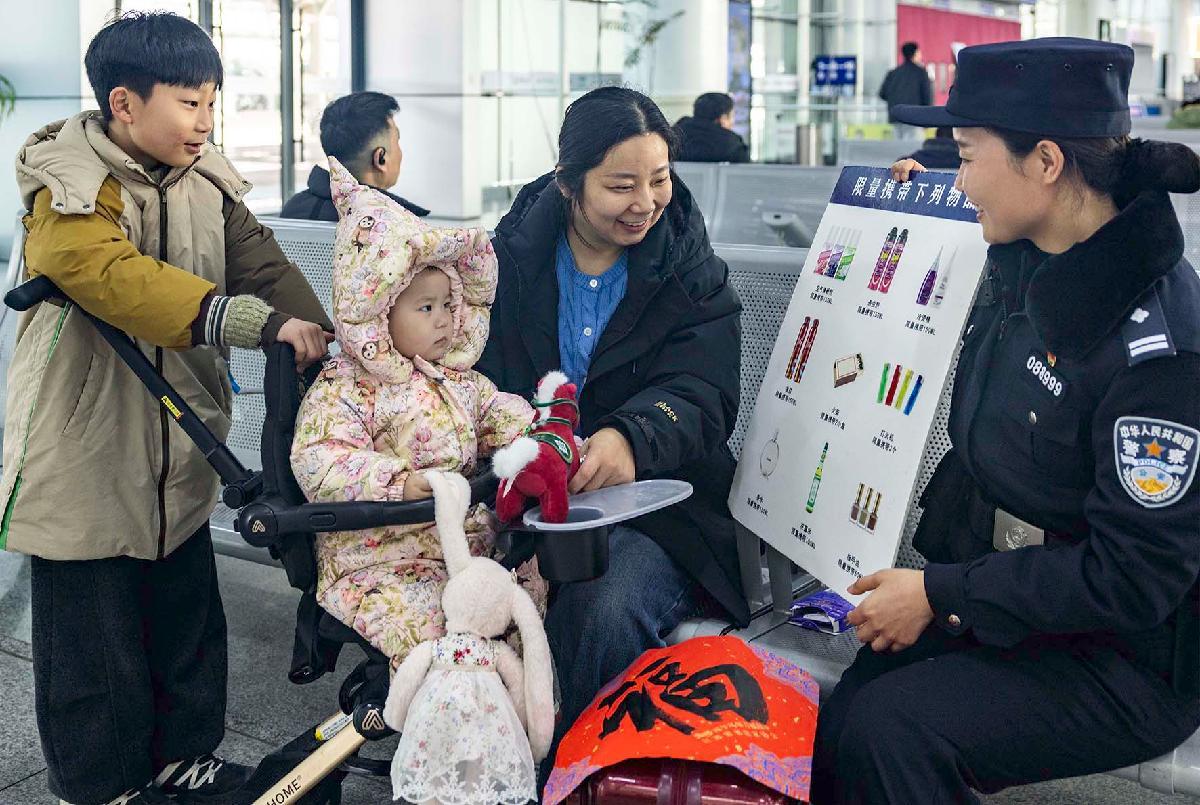2月2日,南京鐵路公安處泰州站派出所民警為旅客講解鐵路安全知識(shí)。