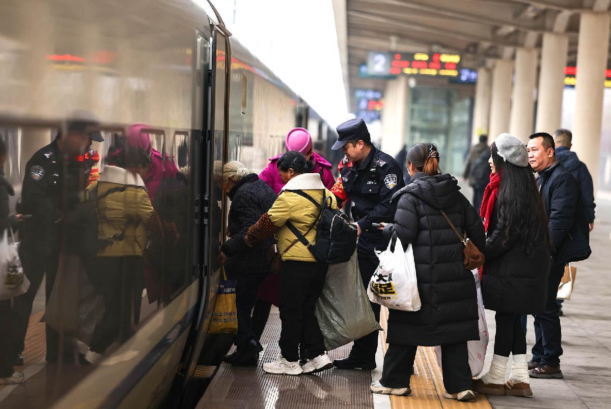 2月2日,在西安火車站站臺(tái),西安鐵路公安處民警在維持乘車秩序。