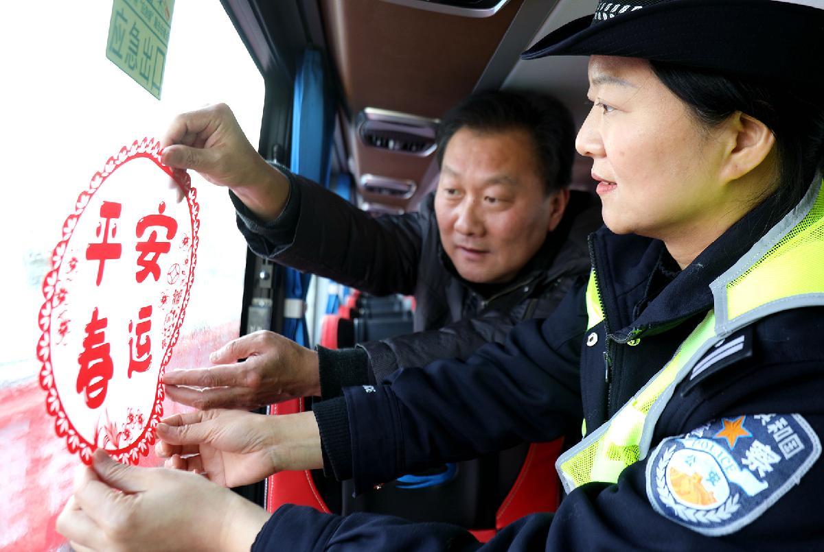 2月2日,2026年春運(yùn)首日。安徽省舒城縣公安局交管大隊(duì)民警深入轄區(qū)客運(yùn)場(chǎng)站為車輛駕駛?cè)诉M(jìn)行春運(yùn)安全提醒、張貼“平安春運(yùn)”,全力筑牢春運(yùn)道路交通安全防線。