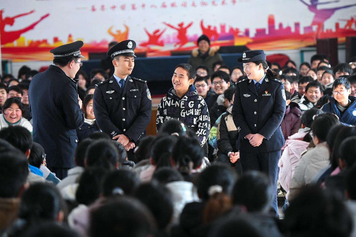 1月26日,在安徽省馬鞍山市和縣善厚中學,當?shù)毓裁窬瘒@“陽光下的守護”這一主題,向?qū)W生開展“拒絕校園欺凌”等法治宣傳,通過案例解析、現(xiàn)場互動等方式,提升學生法治意識和自我保護意識。