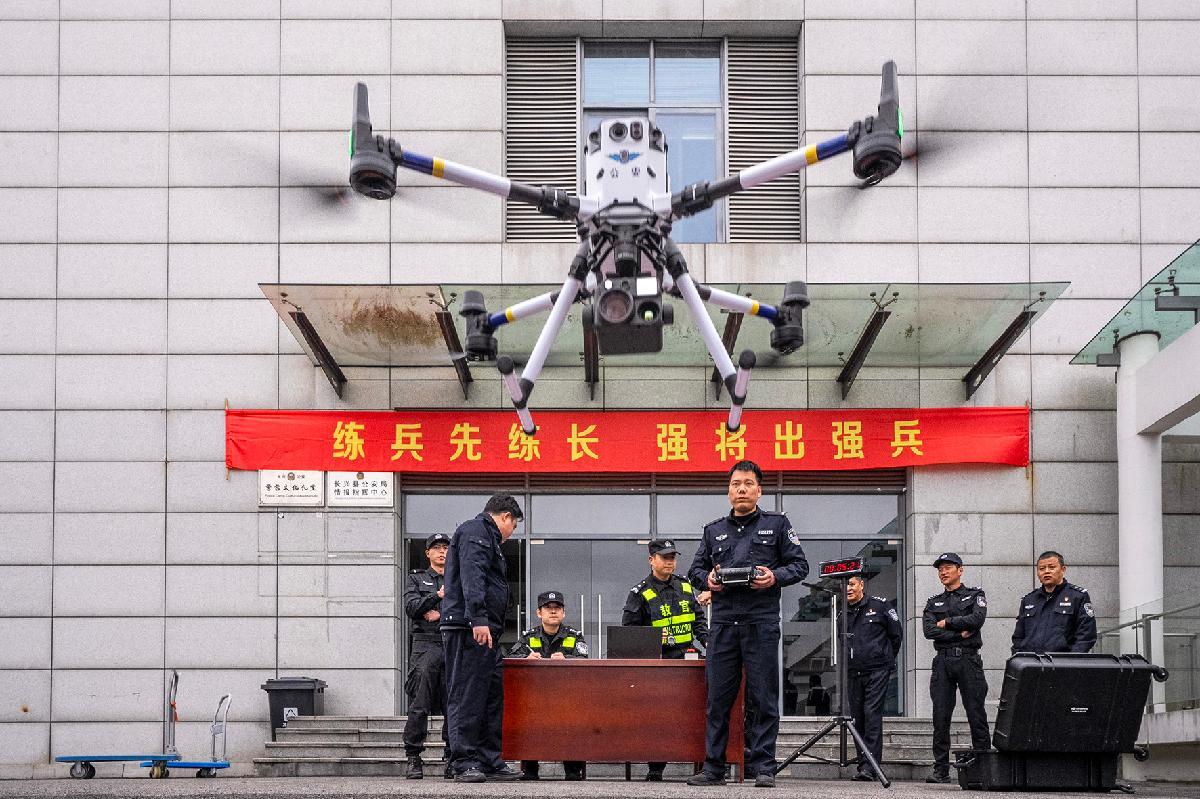 圖為巡特警大隊(duì)組織開展警用無人機(jī)高空偵測(cè)科目比武。