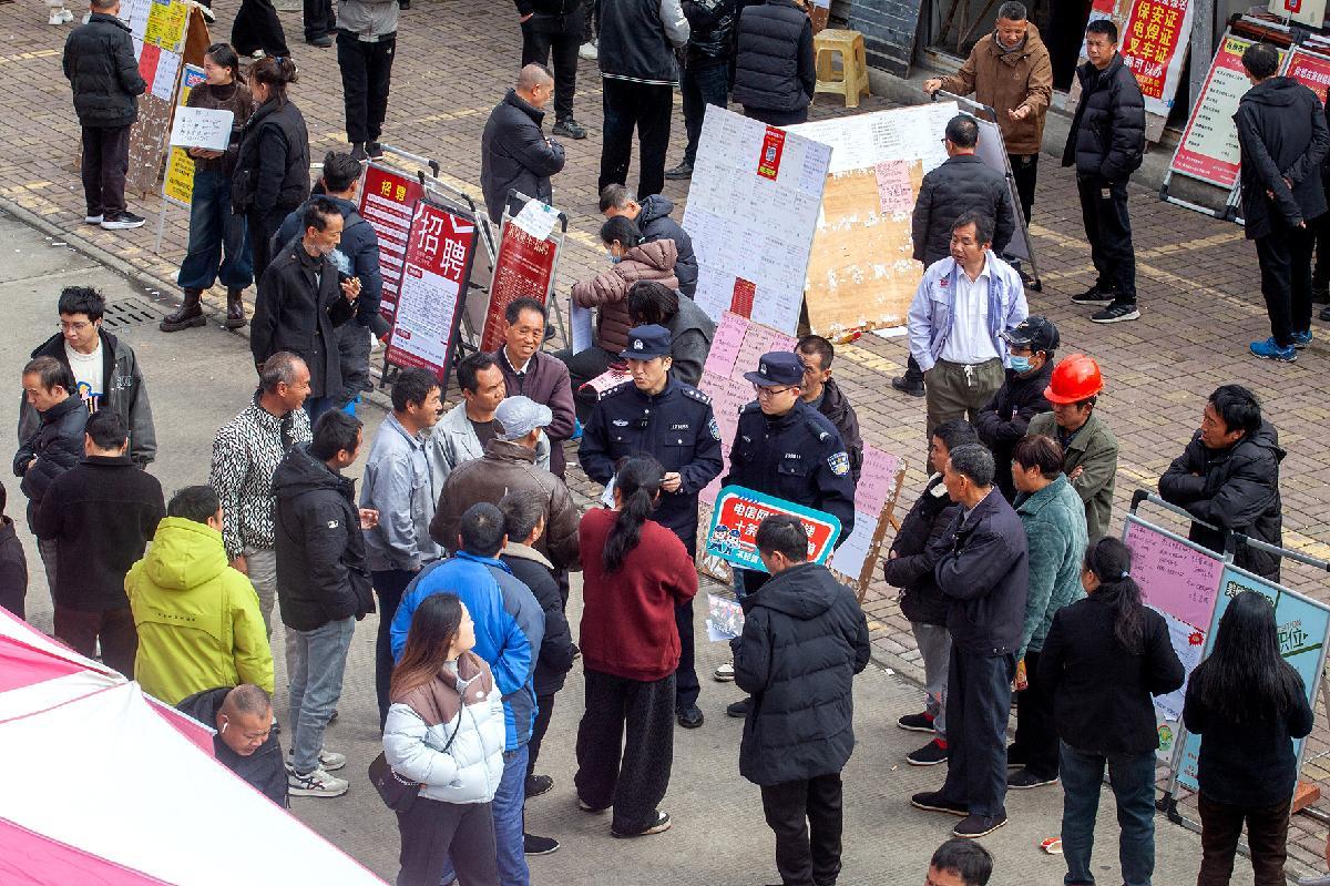 2月27日,浙江省臺州市黃巖區(qū)在人力資源市場舉辦首場新春招聘會。臺州市公安局黃巖分局城北派出所在現(xiàn)場開展以反詐、禁毒為主的安全防范宣傳,提高務工人員的安全防范意識。