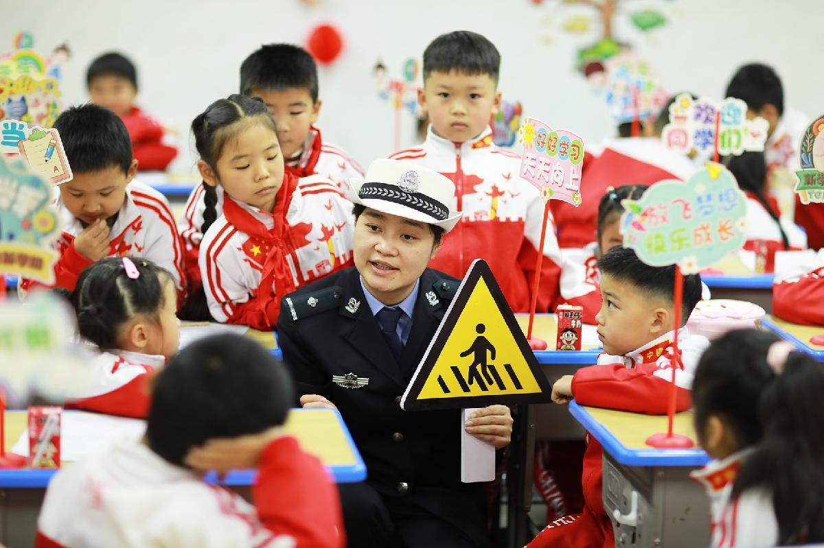 3月2日,在貴州省赤水市第四小學(xué),赤水市公安局交管大隊(duì)民警給學(xué)生講解交通安全知識(shí)。