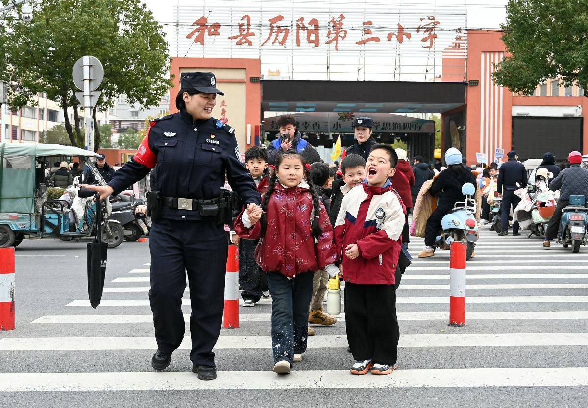 3月4日,安徽省馬鞍山市和縣公安局民警在歷陽鎮(zhèn)第三小學護送學生安全通過馬路。當日,和縣公安局全面啟動“民警護學崗”,維護校園及周邊治安秩序,保障學生安全上下學。