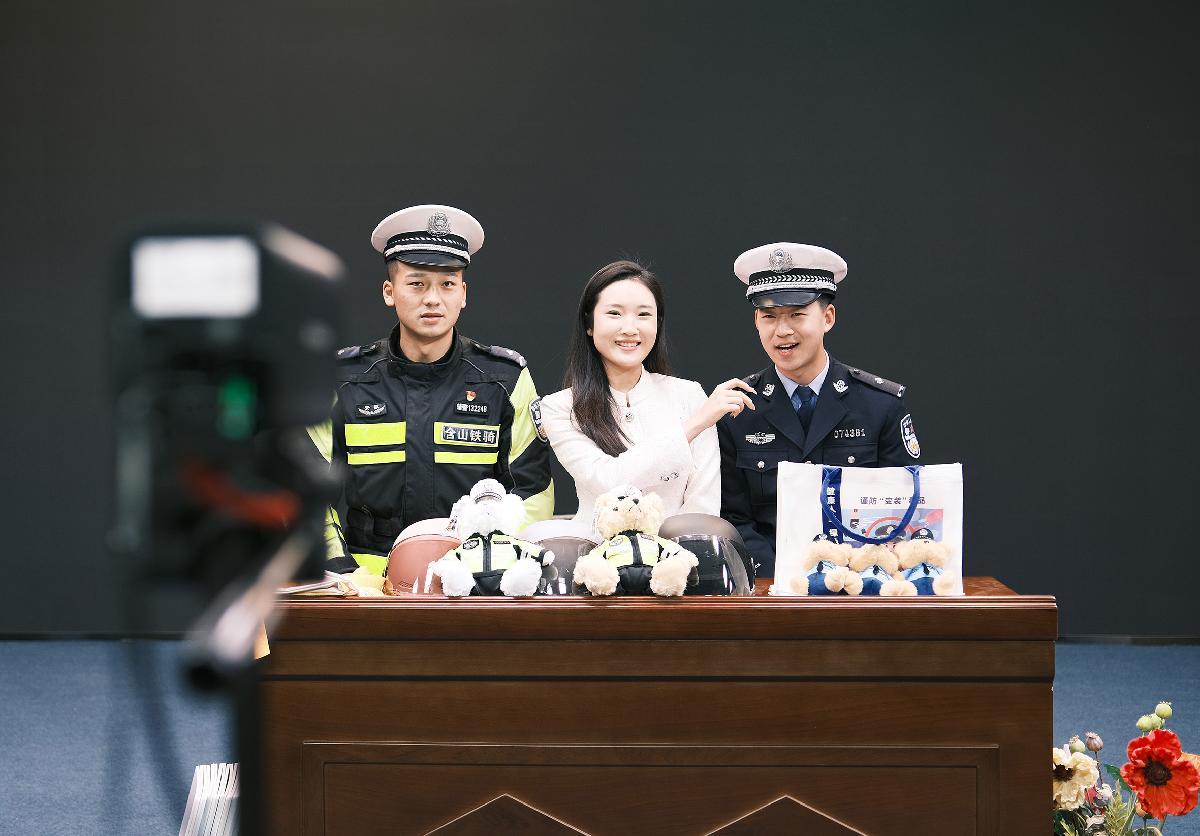 3月5日,在安徽省馬鞍山市含山縣融媒體中心直播室,含山縣公安局民警“線上直播”安全防范知識。