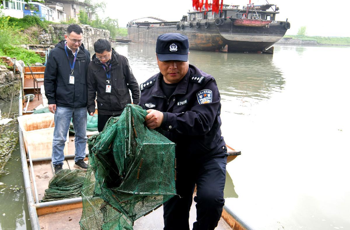 圖為聯(lián)合執(zhí)法人員對裕溪河段打撈出的地籠網(wǎng)進(jìn)行收繳。
