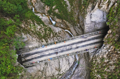 6月29日,俯瞰阿布洛哈村通村公路2、3號(hào)隧道之間的鋼橋。