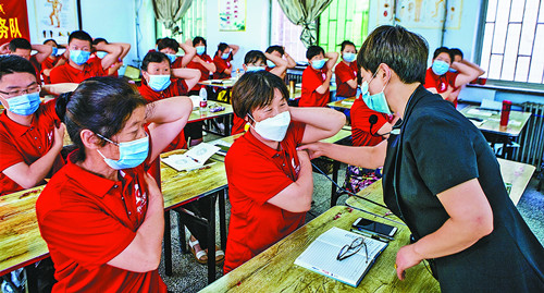 山西省萬榮縣人社部門采取在全縣多點講課的辦法,免費對城鎮(zhèn)失業(yè)人員和農(nóng)村進城務(wù)工人員進行“萬榮人”勞務(wù)品牌相關(guān)培訓(xùn),助他們掌握一技之長,憑結(jié)業(yè)證上崗就業(yè)。圖為近日,在萬榮縣齊家職業(yè)培訓(xùn)學(xué)校,保健按摩老師在手把手教學(xué)員尋找人體穴位。李克榮
