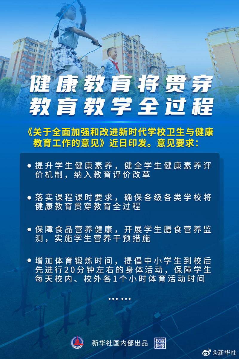 記者3日從教育部新聞發(fā)布會(huì)獲悉,《關(guān)于全面加強(qiáng)和改進(jìn)新時(shí)代學(xué)校衛(wèi)生與健康教育工作的意見》近日印發(fā)。意見要求,將健康教育與德育、智育、體育、美育、勞動(dòng)教育相結(jié)合,融入教育教學(xué)、管理服務(wù)全過程。①提升學(xué)生健康素養(yǎng),健全學(xué)生健康素養(yǎng)評(píng)價(jià)機(jī)制,納入教育評(píng)價(jià)改革。②明確健康教育內(nèi)容。③落實(shí)課程課時(shí)要求,確保各級(jí)各類學(xué)校將健康教育貫穿教育全過程。④拓展健康教育渠道。⑤保障食品營(yíng)養(yǎng)健康,開展學(xué)生膳食營(yíng)養(yǎng)監(jiān)測(cè),實(shí)施學(xué)生營(yíng)養(yǎng)干預(yù)措施。⑥增加體育鍛煉時(shí)間,提倡中小學(xué)生到校后先進(jìn)行20分鐘左右的身體活動(dòng),保障學(xué)生每天校內(nèi)、校外各1個(gè)小時(shí)體育活動(dòng)時(shí)間。⑦強(qiáng)化心理健康教育。⑧養(yǎng)成健康行為習(xí)慣。(記者胡浩,海報(bào)設(shè)計(jì)楊軼群)