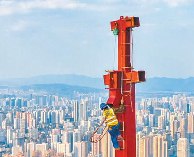 施工人員在重慶陸海國(guó)際中心項(xiàng)目主塔樓樓頂進(jìn)行施工作業(yè)。