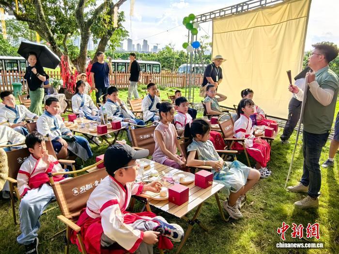 在“51趣·北大”帳篷營地,“少年行”研學(xué)機(jī)構(gòu)的老師正帶著約20名兒童開展研學(xué)活動。 中新網(wǎng)記者 閆旭 攝