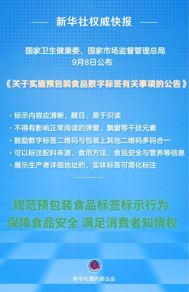 國家衛(wèi)生健康委、國家市場監(jiān)督管理總局9月8日公布《關于實施預包裝食品數(shù)字標簽有關事項的公告》。