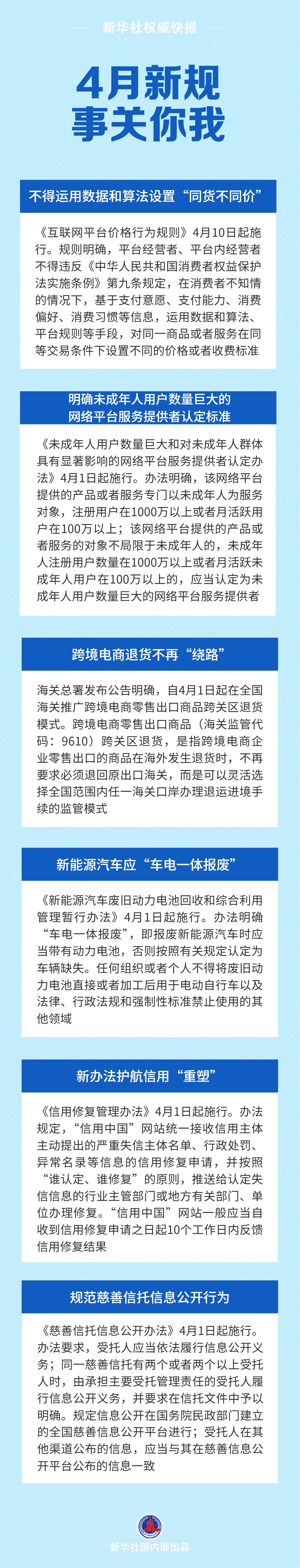 不得運(yùn)用數(shù)據(jù)和算法設(shè)置“同貨不同價(jià)”;明確未成年人用戶數(shù)量巨大的網(wǎng)絡(luò)平臺(tái)服務(wù)提供者認(rèn)定標(biāo)準(zhǔn);跨境電商退貨不再“繞路”……4月新規(guī),事關(guān)你我,一起來看。