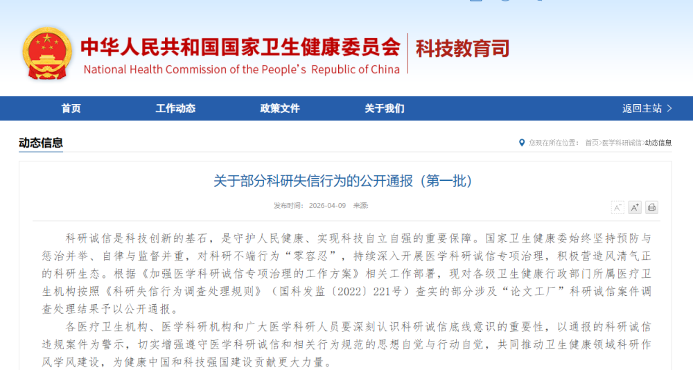 科研誠信是科技創(chuàng)新的基石,是守護人民健康、實現(xiàn)科技自立自強的重要保障。國家衛(wèi)生健康委始終堅持預防與懲治并舉、自律與監(jiān)督并重,對科研不端行為“零容忍”,持續(xù)深入開展醫(yī)學科研誠信專項治理,積極營造風清氣正的科研生態(tài)。根據(jù)《加強醫(yī)學科研誠信專項治理的工作方案》相關工作部署,現(xiàn)對各級衛(wèi)生健康行政部門所屬醫(yī)療衛(wèi)生機構按照《科研失信行為調(diào)查處理規(guī)則》(國科發(fā)監(jiān)〔2022〕221號)查實的部分涉及“論文工廠”科研誠信案件調(diào)查處理結果予以公開通報。