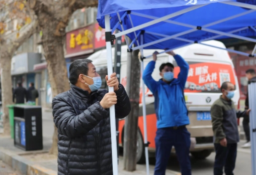 圖③ 田東升(左)協(xié)助社區(qū)搭建防疫帳篷。