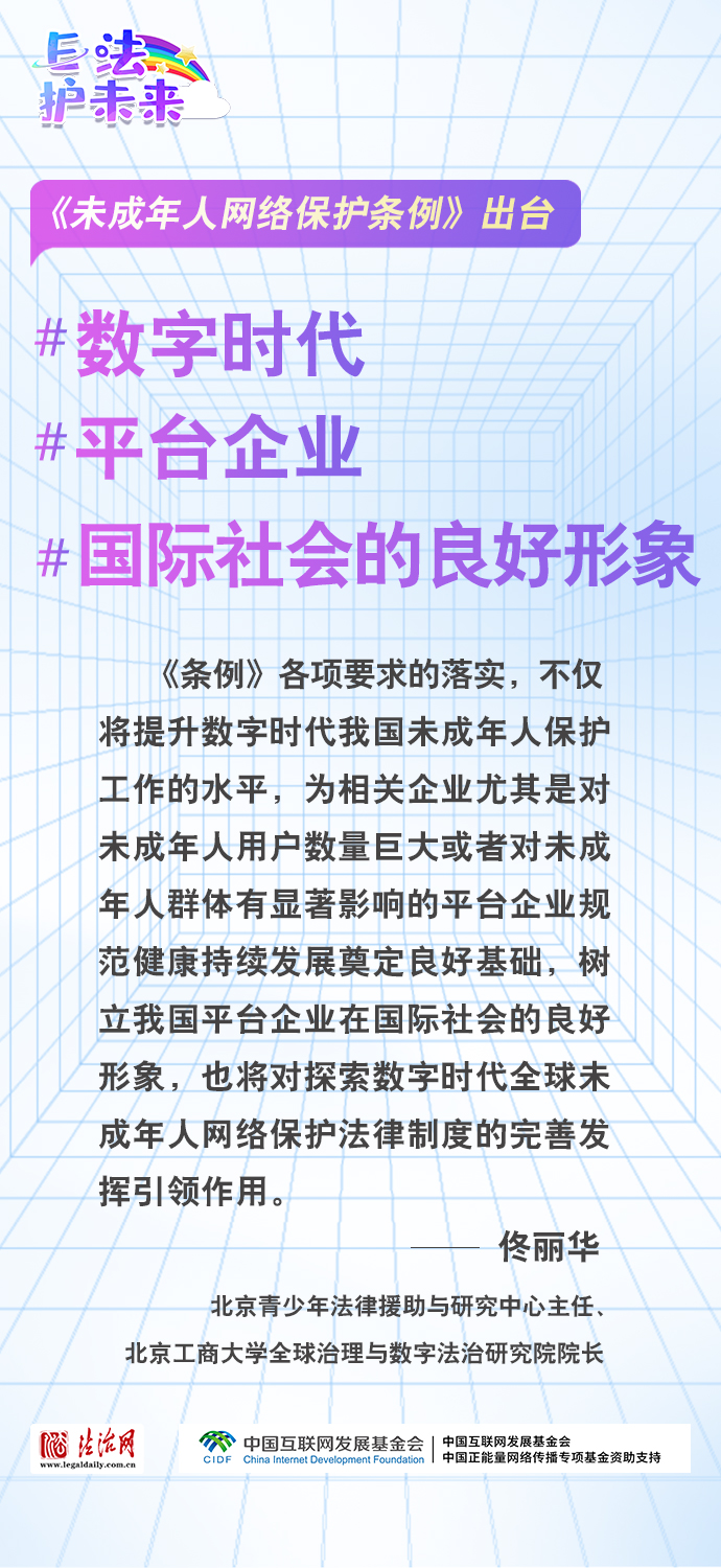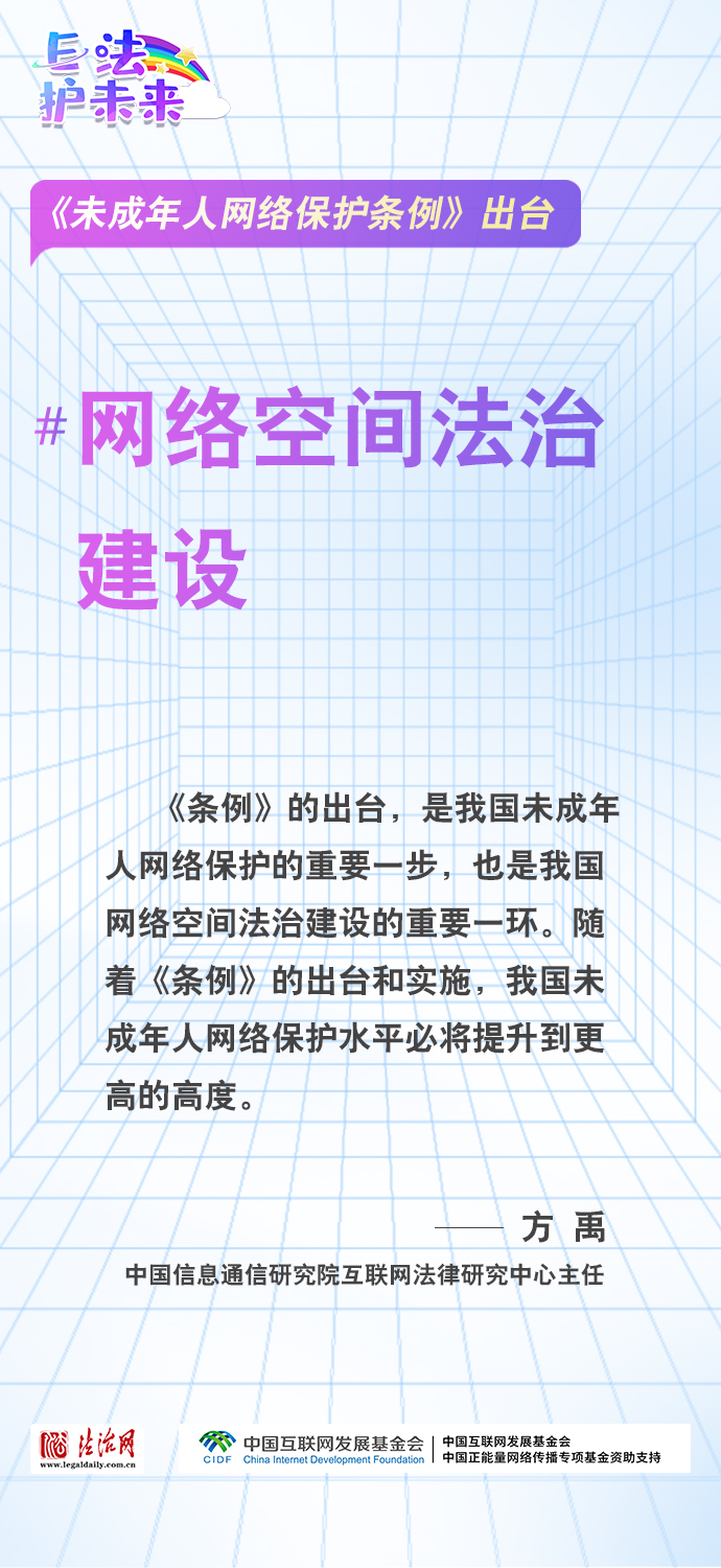 法治網(wǎng)特推出一組“專家有言”海報,內容涵蓋《條例》出臺的現(xiàn)實意義和時代價值、網(wǎng)絡素養(yǎng)促進、網(wǎng)絡信息內容規(guī)范、個人信息網(wǎng)絡保護、網(wǎng)絡沉迷防治等,充分展現(xiàn)《條例》的出臺是我國互聯(lián)網(wǎng)治理領域的法治成果,彰顯中國在未成年人網(wǎng)絡保護領域的擔當,為全球未成年人網(wǎng)絡空間治理提供指引和樣本。