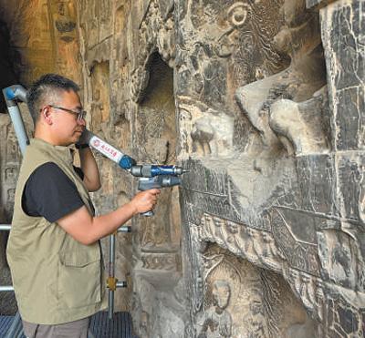 風(fēng)從河面吹來,悶熱的洞窟里有了絲絲涼意。古陽洞內(nèi),腳手架上,馬朝龍和同事正在進(jìn)行石窟測(cè)繪、病害監(jiān)測(cè)。