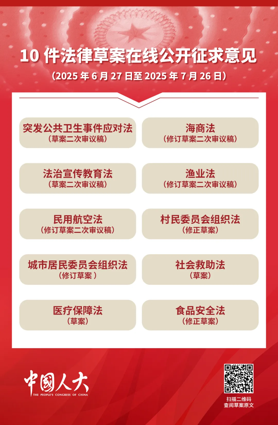 今天起,10件法律草案公開征求意見,截止日期為2025年7月26日。