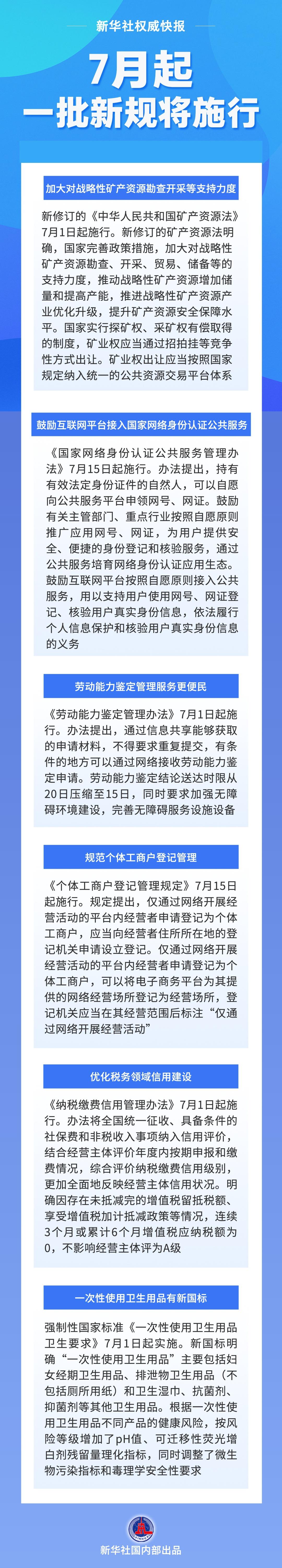 鼓勵互聯(lián)網(wǎng)平臺接入國家網(wǎng)絡(luò)身份認(rèn)證公共服務(wù);勞動能力鑒定管理服務(wù)更便民;規(guī)范個體工商戶登記管理……7月起,一批新規(guī)將施行,一起來看!