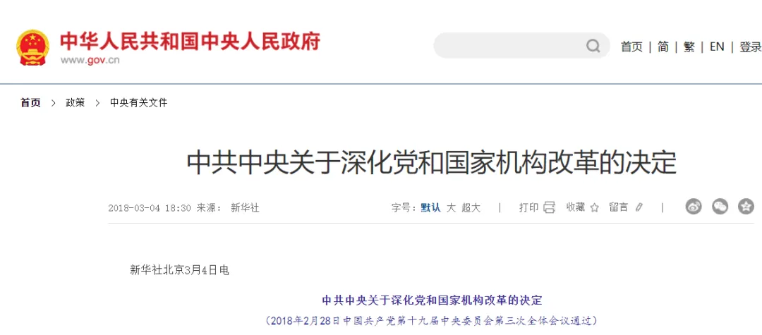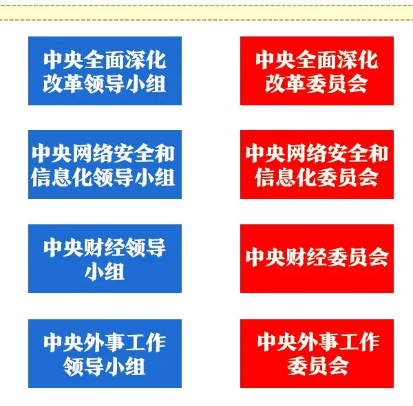 2018年《深化黨和國家機構(gòu)改革方案》把“領(lǐng)導(dǎo)小組”升格為“委員會”:為加強黨中央對涉及黨和國家事業(yè)全局的重大工作的集中統(tǒng)一領(lǐng)導(dǎo),強化決策和統(tǒng)籌協(xié)調(diào)職責(zé),將中央全面深化改革領(lǐng)導(dǎo)小組、中央網(wǎng)絡(luò)安全和信息化領(lǐng)導(dǎo)小組、中央財經(jīng)領(lǐng)導(dǎo)小組、中央外事工作領(lǐng)導(dǎo)小組分別改為中央全面深化改革委員會、中央網(wǎng)絡(luò)安全和信息化委員會、中央財經(jīng)委員會、中央外事工作委員會。