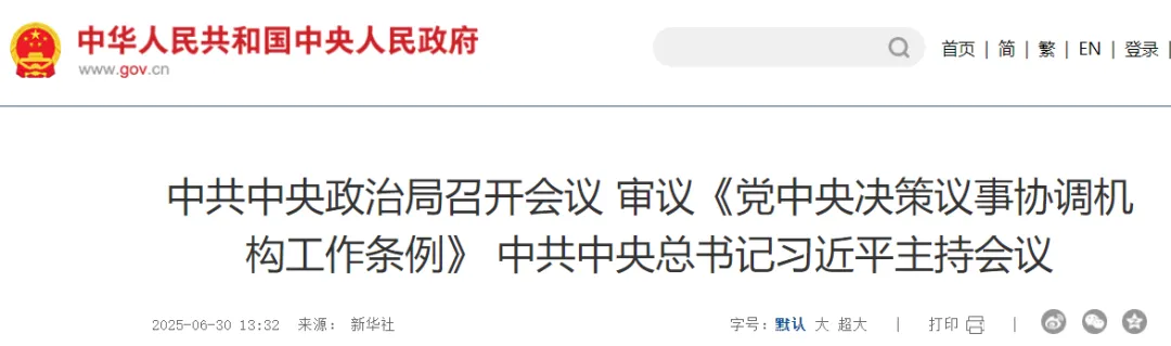 6月30日,習(xí)近平總書記主持召開中共中央政治局會議,審議《黨中央決策議事協(xié)調(diào)機構(gòu)工作條例》。