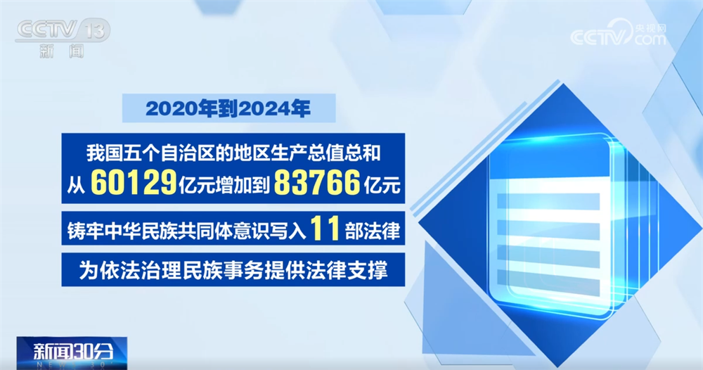 相關(guān)負(fù)責(zé)人表示,2020年到2024年,我國五個(gè)自治區(qū)的地區(qū)生產(chǎn)總值總和從60129億元增加到83766億元。鑄牢中華民族共同體意識(shí)寫入11部法律,為依法治理民族事務(wù)提供法律支撐。