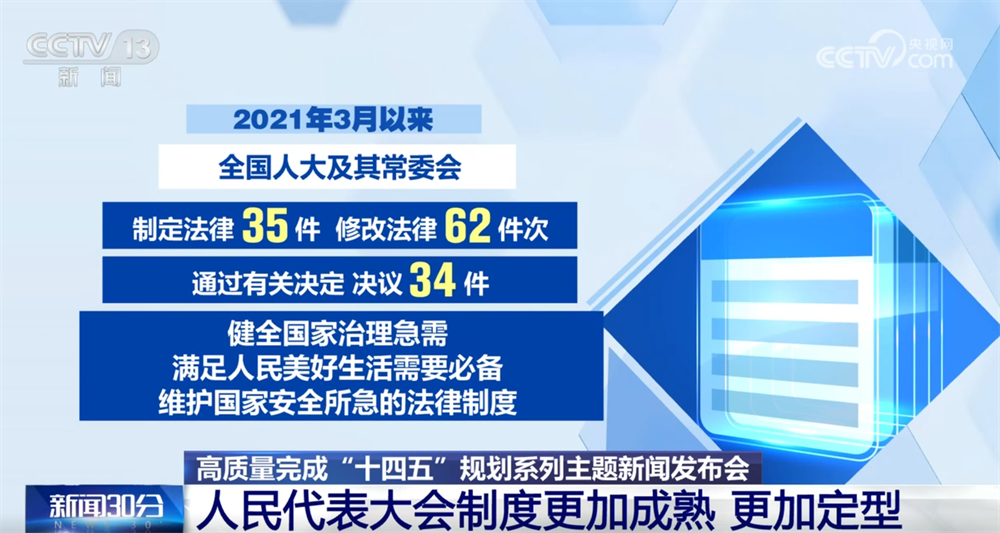 2021年3月以來,全國人大及其常委會(huì)制定法律35件、修改法律62件次,通過有關(guān)決定、決議34件,健全國家治理急需、滿足人民美好生活需要必備、維護(hù)國家安全所急的法律制度。
