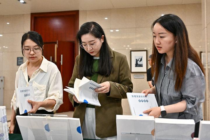 8月21日,與會者在北京舉行的“南海真相”系列智庫報告發(fā)布暨南海問題研討會現(xiàn)場翻閱“南海真相”系列智庫報告。新華社記者 李鑫 攝