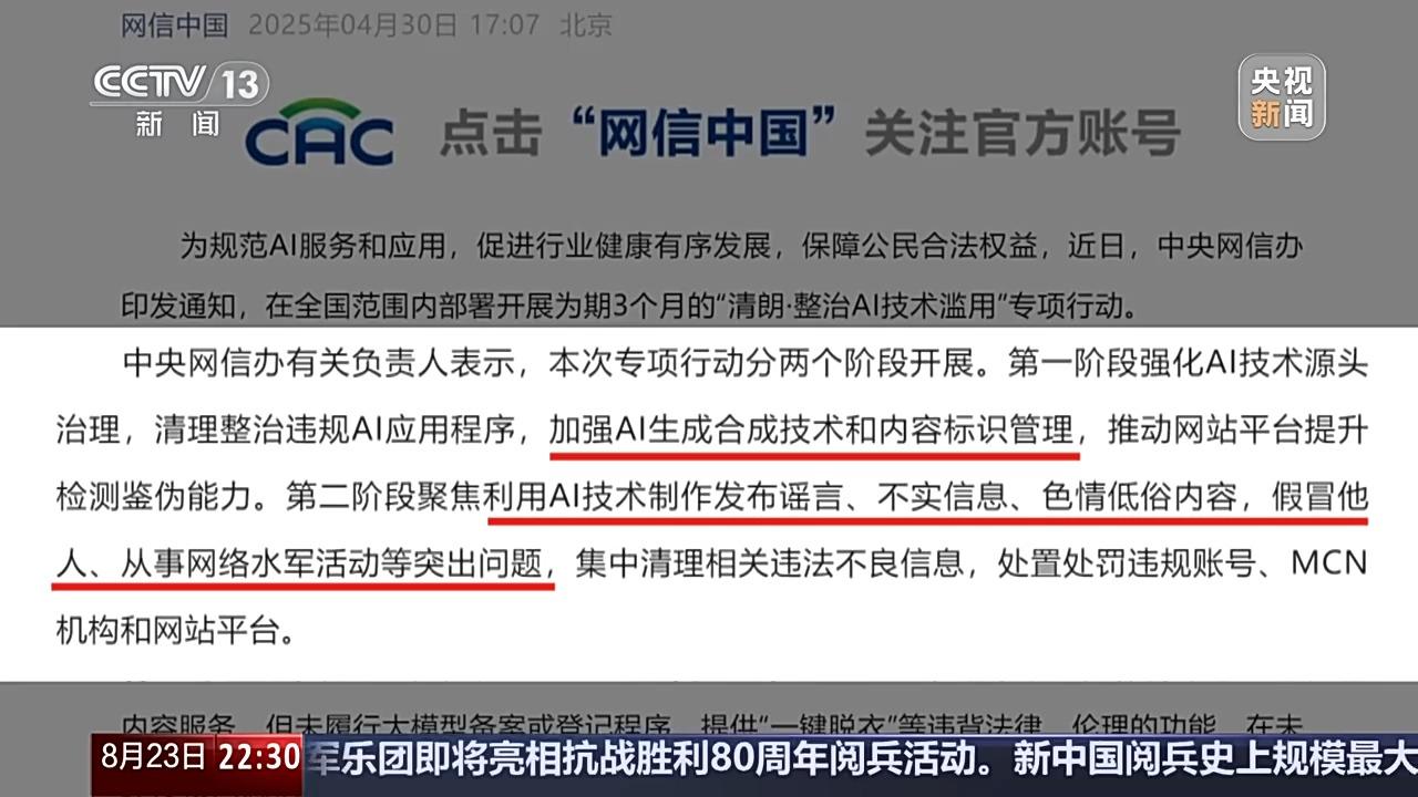 說(shuō)到規(guī)則,關(guān)于AI合成內(nèi)容,幾天后的9月1日,網(wǎng)信辦等四部門印發(fā)的《人工智能生成合成內(nèi)容標(biāo)識(shí)辦法》將開(kāi)始施行,它明確規(guī)定服務(wù)提供者,應(yīng)當(dāng)對(duì)文本、音頻、圖片、視頻等生成合成內(nèi)容,在適當(dāng)位置添加顯式標(biāo)識(shí),也就是說(shuō)今后所有AI作品必須亮明身份,標(biāo)注是AI生成。它的實(shí)施,能改變當(dāng)下AI出現(xiàn)濫用的現(xiàn)狀嗎?