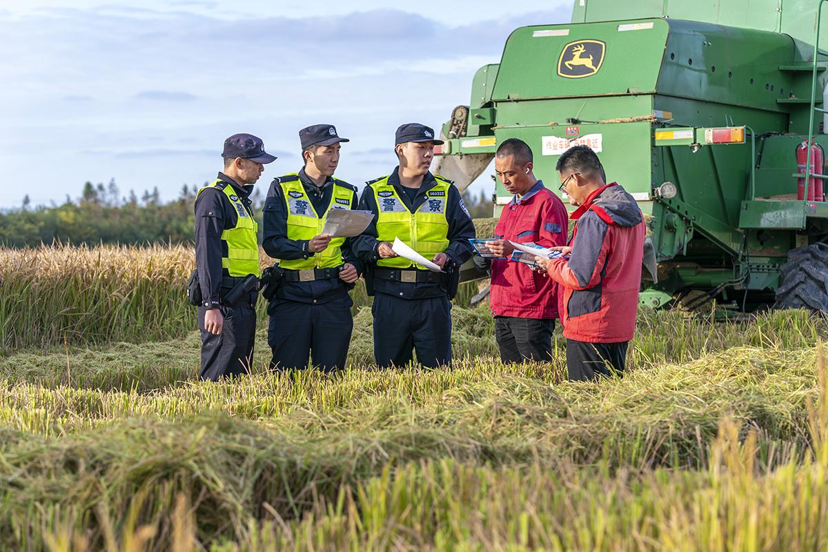 11月11日,上海市公安局崇明分局長江派出所組織民警走進(jìn)田間地頭,向收割晚稻的農(nóng)戶們開展防盜防騙、交通安全提示等宣防工作。