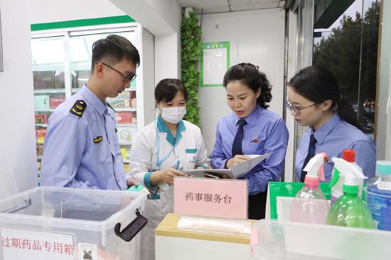 2022年6月14日,胡方(右二)在海州區(qū)某藥店,對(duì)藥事服務(wù)運(yùn)行情況開展檢察建議“回頭看”。 連云港市海州區(qū)檢察院供圖