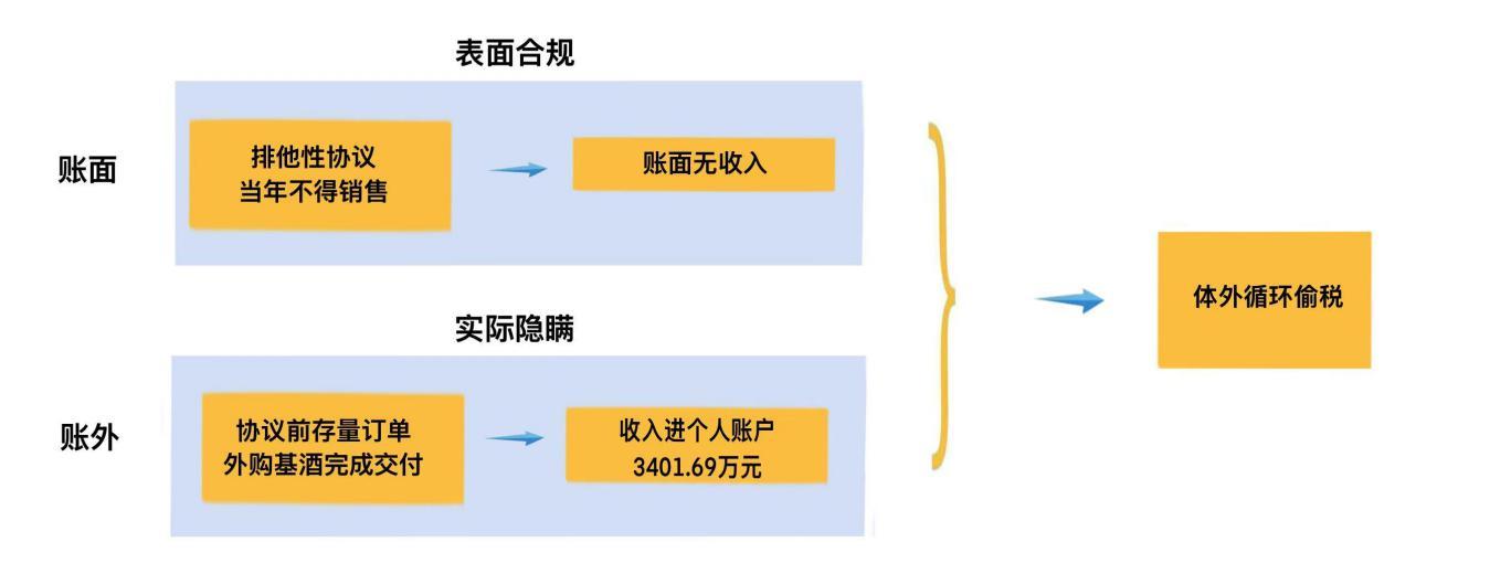 隨著檢查的深入,企業(yè)法定代表人承認(rèn),為了履行2021年前簽訂且已收取定金的存量合同,鵬程酒廠在簽訂排他性協(xié)議后,通過外購基酒和包裝材料完成了訂單交付,而這些交易產(chǎn)生的銷售收入,均未經(jīng)過企業(yè)對(duì)公賬戶。