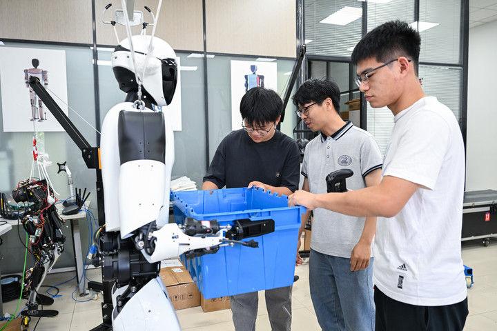 近年來,湖北省加快布局人形機(jī)器人領(lǐng)域,依托省內(nèi)高校院所的人才優(yōu)勢和創(chuàng)新體系優(yōu)勢,組織武漢大學(xué)、華中科技大學(xué)等參與人形機(jī)器人相關(guān)項(xiàng)目研發(fā),集中推出“天問”“勞動者”“荊楚”等一系列人形機(jī)器人。這是2025年5月29日,在華中科技大學(xué)機(jī)械科學(xué)與工程學(xué)院,博士研究生丁濤(右二)和團(tuán)隊(duì)成員測試“荊楚”人形機(jī)器人的搬運(yùn)能力。