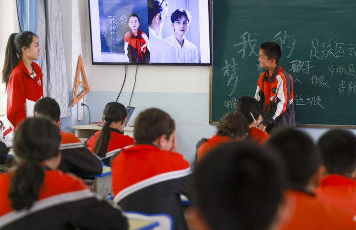 新疆克孜勒蘇柯爾克孜自治州阿圖什市哈拉峻鄉(xiāng)謝依特小學(xué),是一所主要面向柯爾克孜族學(xué)生的村級小學(xué),2022年8月成為該州首個西部計(jì)劃志愿者包校支教的試點(diǎn)學(xué)校。23名戍邊支教西部計(jì)劃志愿者服務(wù)隊(duì)的志愿者,在這所小學(xué)承擔(dān)著教書育人的工作。經(jīng)過近三年的支教服務(wù),學(xué)生的學(xué)習(xí)成績顯著提高,得到當(dāng)?shù)貜V泛認(rèn)可。這是2025年4月23日,支教教師高淑賢(左一)在班級里展示她為學(xué)生們制作的“AI夢想職業(yè)照”。