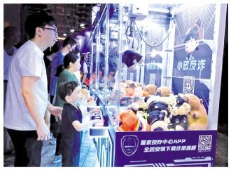 圖為在反詐互動區(qū),家長帶著小朋友在“反詐抓娃娃機”前,嘗試抓取“反詐公仔”。