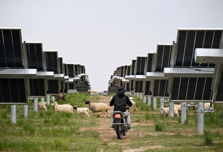 2025年6月18日,牧民在位于青海省海南藏族自治州的青海黃河上游水電開發(fā)有限責任公司共和光伏產(chǎn)業(yè)園放羊。該光伏產(chǎn)業(yè)園推廣“光伏+生態(tài)”模式,將昔日荒灘變成牧場。新華社記者 金良快 攝