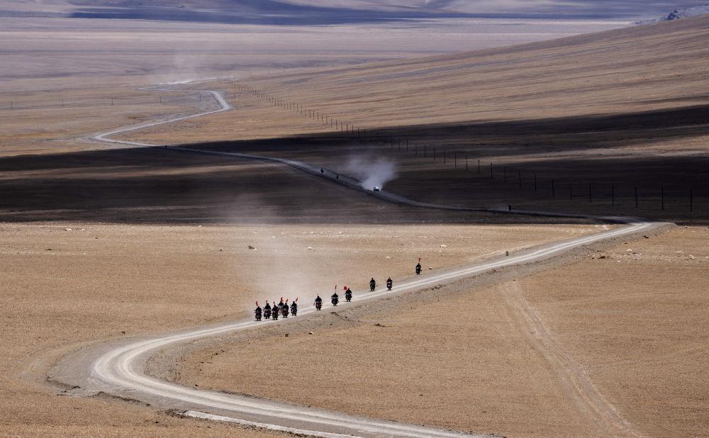 2023年6月2日,50歲的昌果護邊聯(lián)防隊隊長石角帶領(lǐng)隊員在日喀則市薩嘎縣昌果鄉(xiāng)騎著摩托車前往33號界樁巡邏。昌果鄉(xiāng)是與尼泊爾接壤的邊境鄉(xiāng),有105公里的邊境線,5條通外山口。1996年,昌果邊防工作站成立,石角主動申請成為一名聯(lián)防隊員。從1個到103個——27年間,這支由普通牧民組成的護邊聯(lián)防隊不斷壯大,讓國旗飄揚在國境線的每個角落。