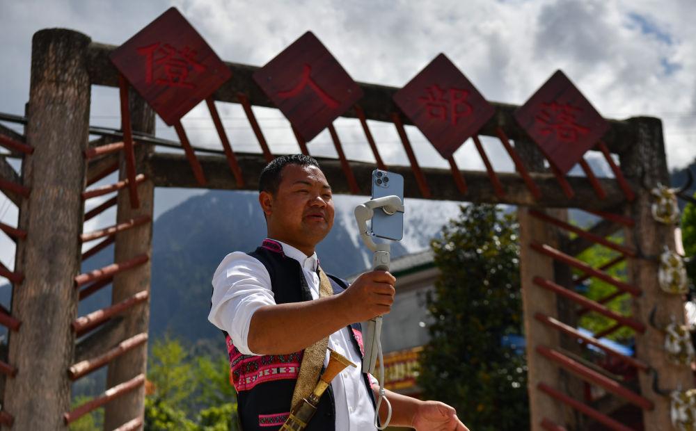2022年4月19日,生活在僜人聚居村——林芝市察隅縣沙瓊村的僜人迪龍通過手機直播。僜人俗稱“僜巴”,是生活在我國西藏邊境的族群,人口較少。2017年起,迪龍通過制作短視頻、直播帶貨等途徑,介紹僜人文化和察隅縣風情,推廣當?shù)孛麅?yōu)特產(chǎn),讓野生靈芝、羊肚菌等長在深山的寶貝也走向大山外更廣闊的市場。