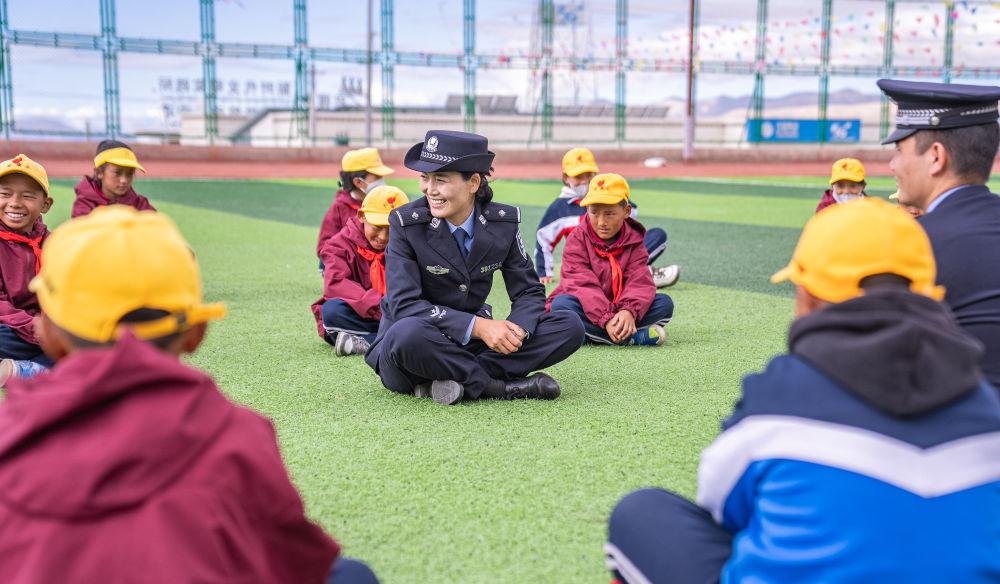 2025年6月23日,巴桑普赤在巴嘎鎮(zhèn)小學和學生們互動。阿里地區(qū)普蘭縣巴嘎鎮(zhèn)塔爾欽國際旅游小鎮(zhèn)面朝納木那尼峰,背靠岡仁波齊,是游客們轉(zhuǎn)山徒步的重要門戶,每年都要接待成千上萬的游客。2023年,巴桑普赤主動來到塔爾欽邊境派出所,成為這里的第一位女民警,而在從警前,她是一名小學數(shù)學教師。在這里,游客高反昏迷、孩子轉(zhuǎn)山走失、背包客遺失手機之類的警情層出不窮,塔爾欽邊境派出所民警需要時刻待命,處理各種突發(fā)狀態(tài)。目前,“警察阿佳”(“阿佳”在藏語里是姐姐的意思)的隊伍還在壯大,今年派出所還會迎來新一批女民警與巴桑普赤并肩守護高原。
