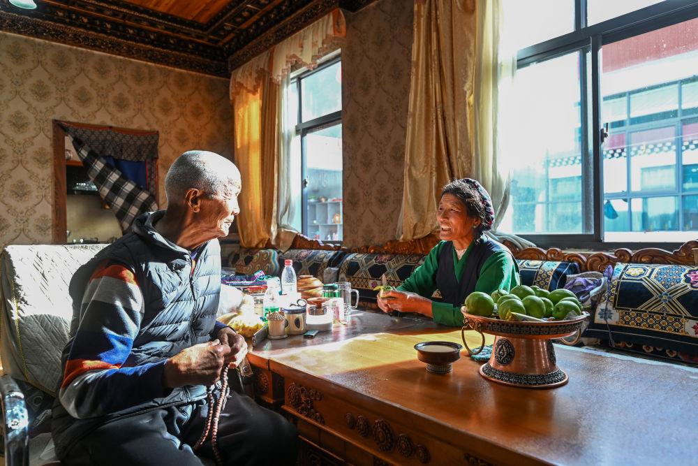 2025年7月21日,58歲的林芝市朗縣拉丁雪村婦聯(lián)主席格桑德青(右)在自家改造提升后的餐廳里為88歲的父親喬多吉削水果。近年來,西藏邊境縣朗縣堅持“群眾自愿、因地制宜、循序漸進”原則,推進農(nóng)村房屋改造提升建設(shè)。拉丁雪村采取“政府主導、群眾參與、適當補貼、統(tǒng)規(guī)自建”模式,對有意愿的群眾實施住房改造提升。針對村民住房多為石木結(jié)構(gòu),抗震等級低、采光差等問題,當?shù)仄刚垖I(yè)設(shè)計團隊,最大限度滿足群眾房屋功能布局需求。截至2025年7月底,拉丁雪村已有42戶178人入住新房。