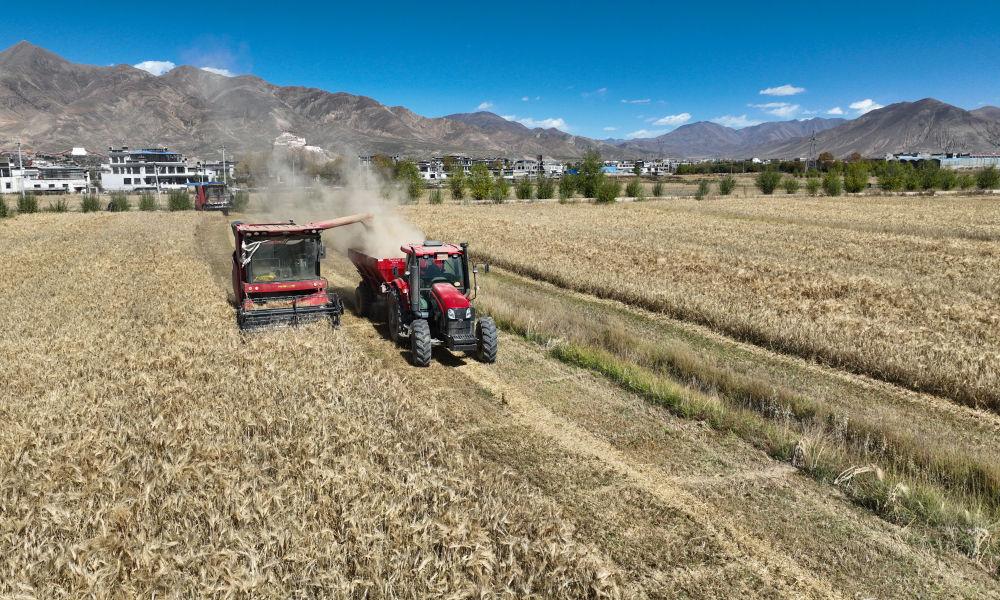 2024年10月16日,日喀則市江孜縣班覺倫布村農(nóng)機服務(wù)農(nóng)民專業(yè)合作社社員使用農(nóng)機收獲青稞。青稞是青藏高原地區(qū)的特有農(nóng)作物。近年來,西藏多地立足資源稟賦,加快發(fā)展青稞特色產(chǎn)業(yè),延伸青稞產(chǎn)業(yè)鏈,從傳統(tǒng)粗加工向精深加工轉(zhuǎn)型。江孜縣研發(fā)生產(chǎn)的青稞系列產(chǎn)品達40余種,青稞糌粑粉、青稞啤酒等在青藏高原大有名氣,青稞餅干、青稞飲料等銷往上海、江蘇等地。2024年,江孜縣青稞產(chǎn)業(yè)產(chǎn)值達1.48億元,較上年增長66%。