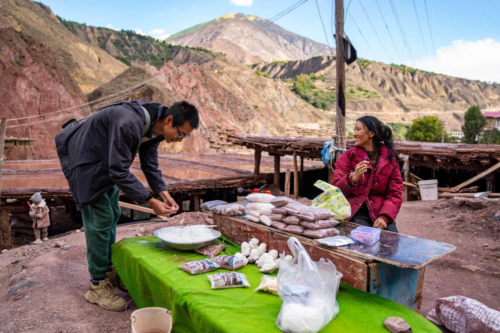 2023年10月20日,昌都市芒康縣納西民族鄉(xiāng)加達村村民在鹽田旁向游客推銷自家產(chǎn)的鹽。加達村位于瀾滄江畔,從唐代開始制鹽,距今已延續(xù)1300余年。當?shù)卮迕癖3种嫉氖止覃}方式,從瀾滄江畔的鹽井、鹽池中取出鹵水倒入鹽田,經(jīng)陽光蒸曬、風干,結(jié)晶成鹽。依托千年古鹽田,當?shù)靥剿鳟a(chǎn)業(yè)融合發(fā)展模式,大力發(fā)展旅游產(chǎn)業(yè),越來越多的游客慕名“打卡”,帶動村民增收致富。