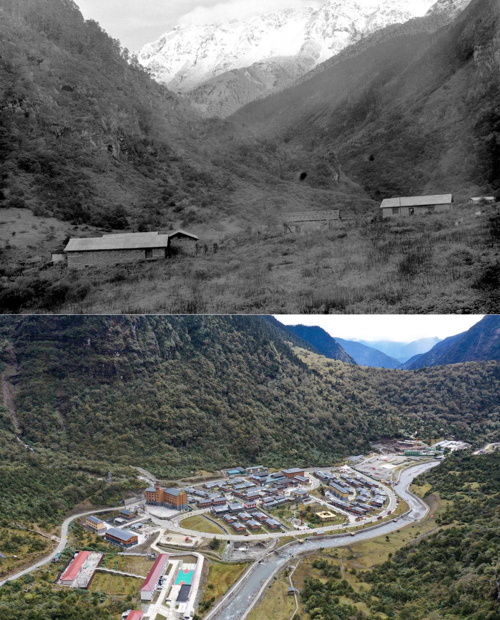 上圖為1997年9月拍攝的玉麥鄉(xiāng);下圖為2024年10月14日拍攝的玉麥鄉(xiāng)。山南市隆子縣玉麥鄉(xiāng)地處喜馬拉雅山脈南麓,受惡劣自然條件影響,這里一度只有桑杰曲巴和女兒卓嘎、央宗三人居住,牢牢守在祖國邊境線上,曾被稱為“三人鄉(xiāng)”。從2018年開始,玉麥鄉(xiāng)開展邊境小康村及配套設(shè)施建設(shè),輕鋼龍骨架構(gòu)民居及排水、通訊、學校、中心公園等公共服務(wù)設(shè)施拔地而起。2019年,國家投資超5億元、總里程50公里的曲玉柏油公路改建工程全面完工,解除了玉麥每年大雪封山的困擾;同時,國家電網(wǎng)將10千伏的輸電線路接入玉麥,玉麥人用上了安全穩(wěn)定的常明電。如今,當?shù)匾寻l(fā)展到67戶200多人,變成下轄兩個行政村的“小康鄉(xiāng)”。2023年,玉麥全鄉(xiāng)人均年收入超4萬元,人均居住面積達40平方米。