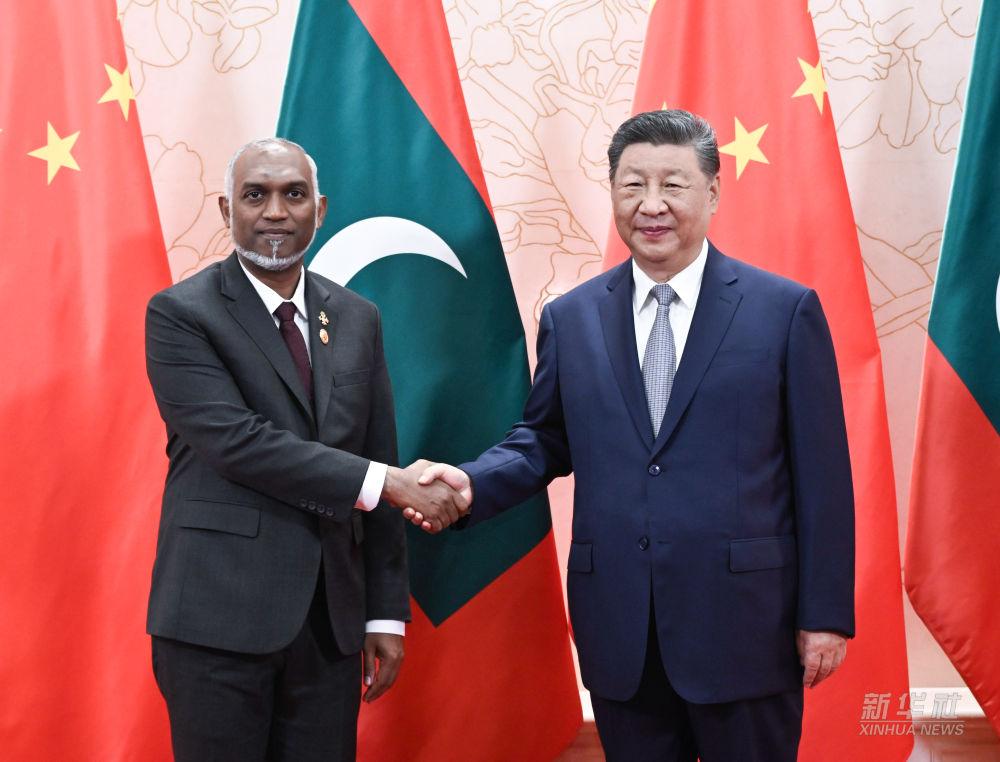 8月31日上午,國家主席習(xí)近平在天津迎賓館會見來華出席2025年上海合作組織峰會和紀(jì)念中國人民抗日戰(zhàn)爭暨世界反法西斯戰(zhàn)爭勝利80周年活動的馬爾代夫總統(tǒng)穆伊茲。