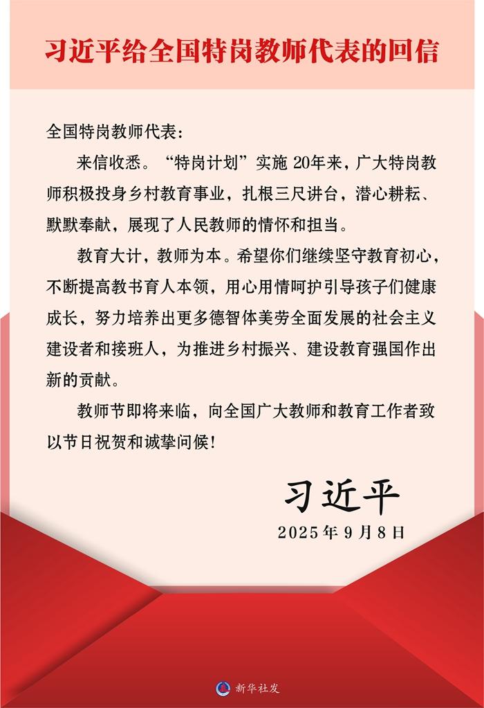 新華社北京9月9日電 在第四十一個(gè)教師節(jié)來臨之際,中共中央總書記、國(guó)家主席、中央軍委主席習(xí)近平給全國(guó)特崗教師代表回信,提出殷切希望,并向全國(guó)廣大教師和教育工作者致以節(jié)日祝賀和誠(chéng)摯問候。