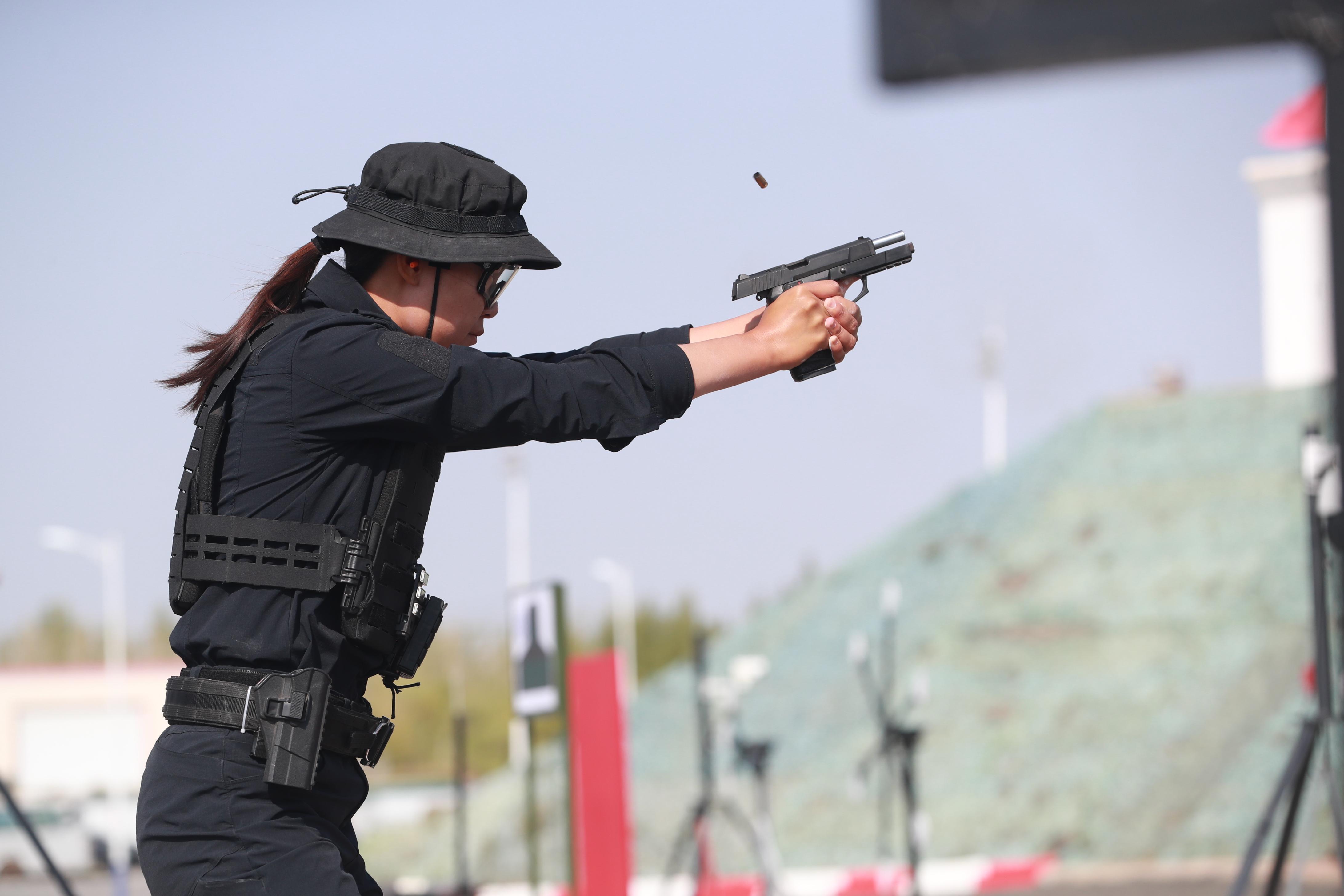 “3、2、1——開(kāi)始!”裁判口令剛落,來(lái)自烏魯木齊市公安局的特警馮瑞迅速向前推進(jìn),推開(kāi)并穿過(guò)簡(jiǎn)易門(mén)后對(duì)模擬房間內(nèi)的5米靶、10米靶、20米靶等進(jìn)行射擊,射擊完畢后,跑回終點(diǎn),最終用時(shí)33秒多。這是“制敵速射”項(xiàng)目中手槍快速射擊科目比賽的現(xiàn)場(chǎng)。馮瑞是參加這個(gè)科目的唯一一名女選手,斬獲個(gè)人第二名。