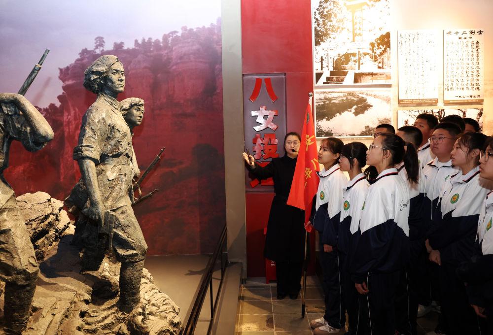2025年4月3日,抗聯(lián)中學(xué)學(xué)生在東北抗聯(lián)史實(shí)陳列館聽講解員講述八女投江的故事。遼寧省本溪市本溪滿族自治縣抗聯(lián)中學(xué)與東北抗聯(lián)史實(shí)陳列館相距不足百米,每年都會(huì)開展東北抗聯(lián)精神教育活動(dòng),組織學(xué)生到陳列館,向抗聯(lián)英烈敬獻(xiàn)花籃,緬懷抗戰(zhàn)往事。近年來(lái),為推動(dòng)青少年更好地傳承紅色基因,遼寧積極推動(dòng)抗聯(lián)精神融入大中小學(xué)思政課一體化建設(shè),編輯《中小學(xué)生抗聯(lián)史讀本》,圍繞“繼承抗聯(lián)傳統(tǒng)、學(xué)習(xí)抗聯(lián)精神”等主題舉辦表演、征文、競(jìng)賽、夏令營(yíng)和冬令營(yíng)等活動(dòng)。